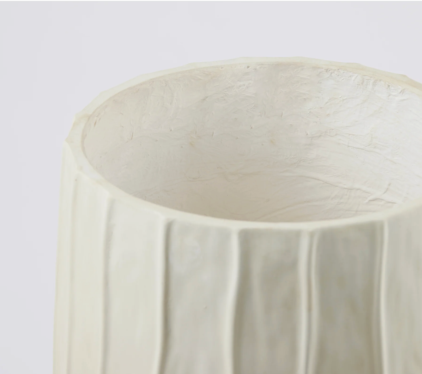 La forma bombata, morbida e avvolgente, incontra una raffinata lavorazione a righe che dona movimento e profondità alla superficie. Realizzato in ceramica resinpietra bianca, ha una presenza materica importante ma elegante, perfetta per ambienti contemporanei e ricercati.
